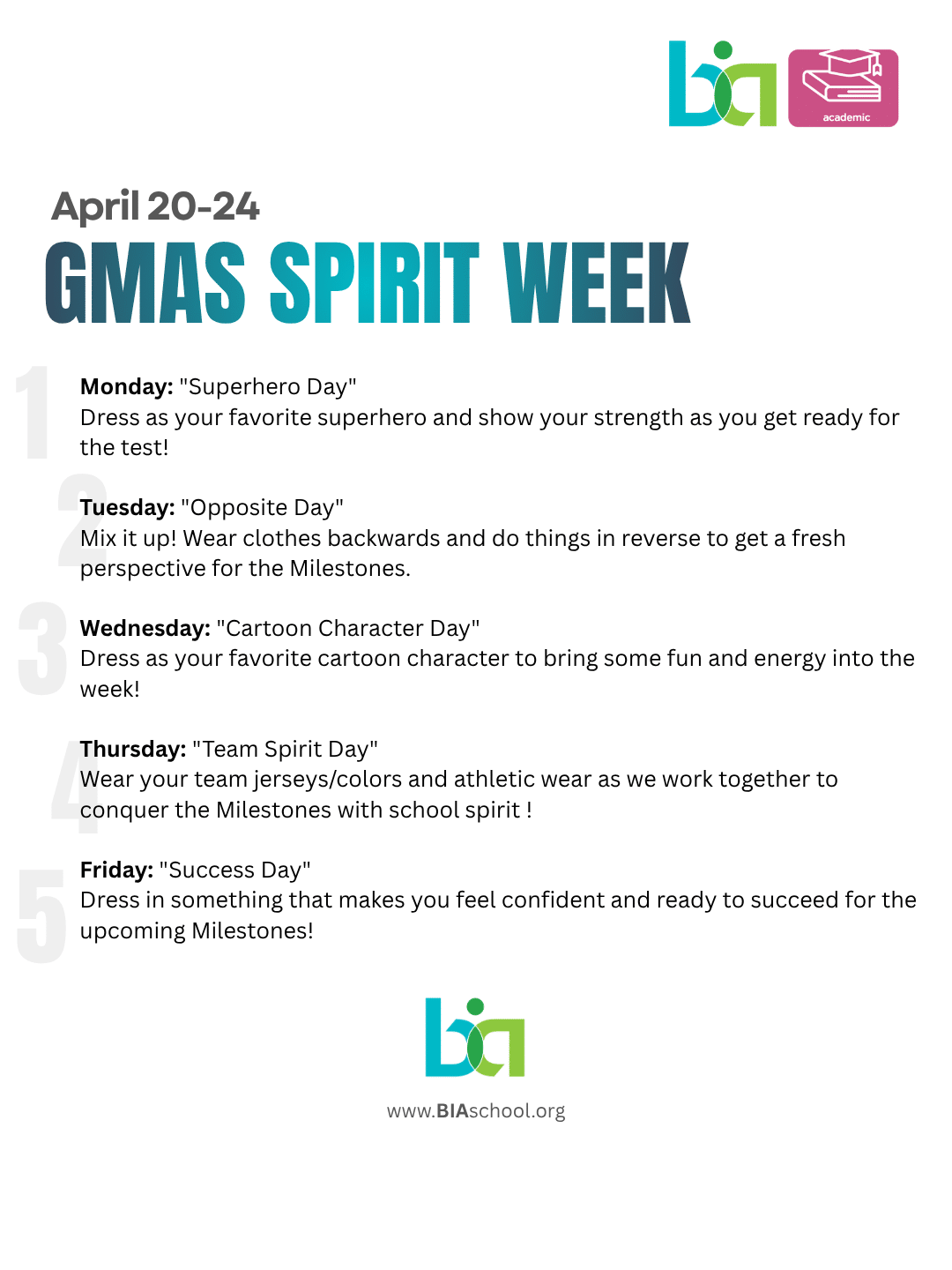GMAS Spirit Week, April 20 – 24 April 20 - April 24 BIA Charter School 186 Hunter Street Northwest, Norcross April 20 - 24 GMAS Spirit Week